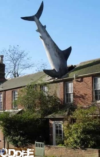 Em Oxford, no sudeste da Inglaterra, quem passa na frente da casa de Bill Heine não entende direito que treco é aquele no telhado. Com a cabeça enfiada na construção, um tubarão de 8 m “decora” o teto da residência. Ele está lá desde dezembro de 1986. O dono da casa construiu o tubarão como uma forma de protesto contra os países que mantêm usinas nucleares